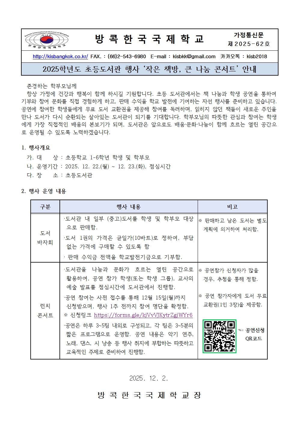 (제2025-62호) 2025학년도 초등도서관 행사 '작은 책방 , 큰 나눔 콘서트' 안내