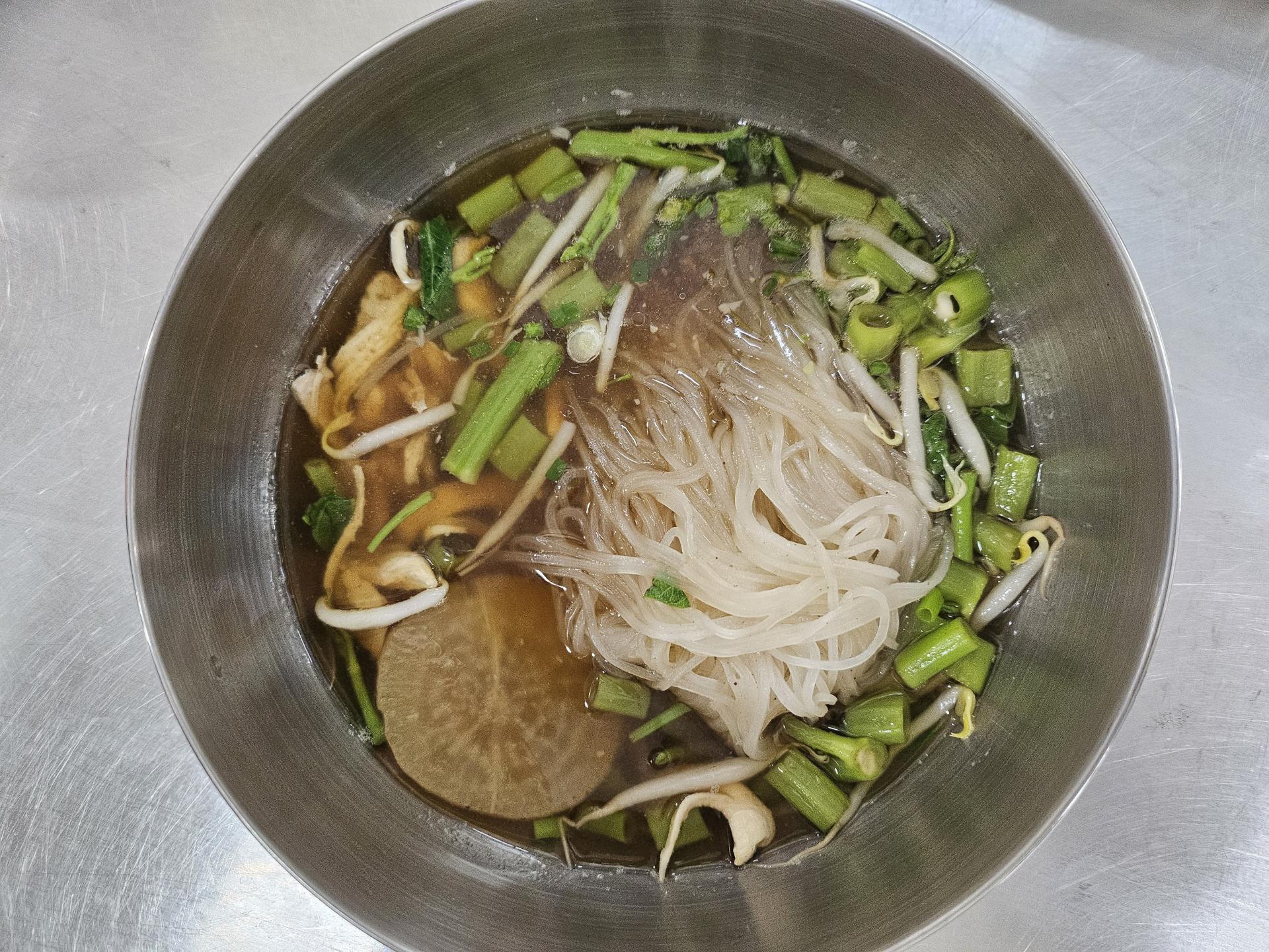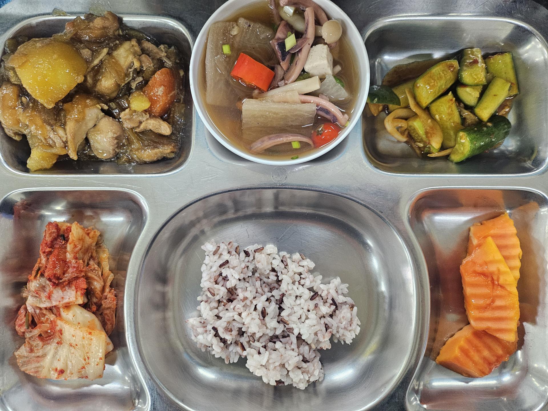 흑미밥, 오징어무국, 찜닭, 두반장오이무침, 배추김치, 파파야, 쌈채소