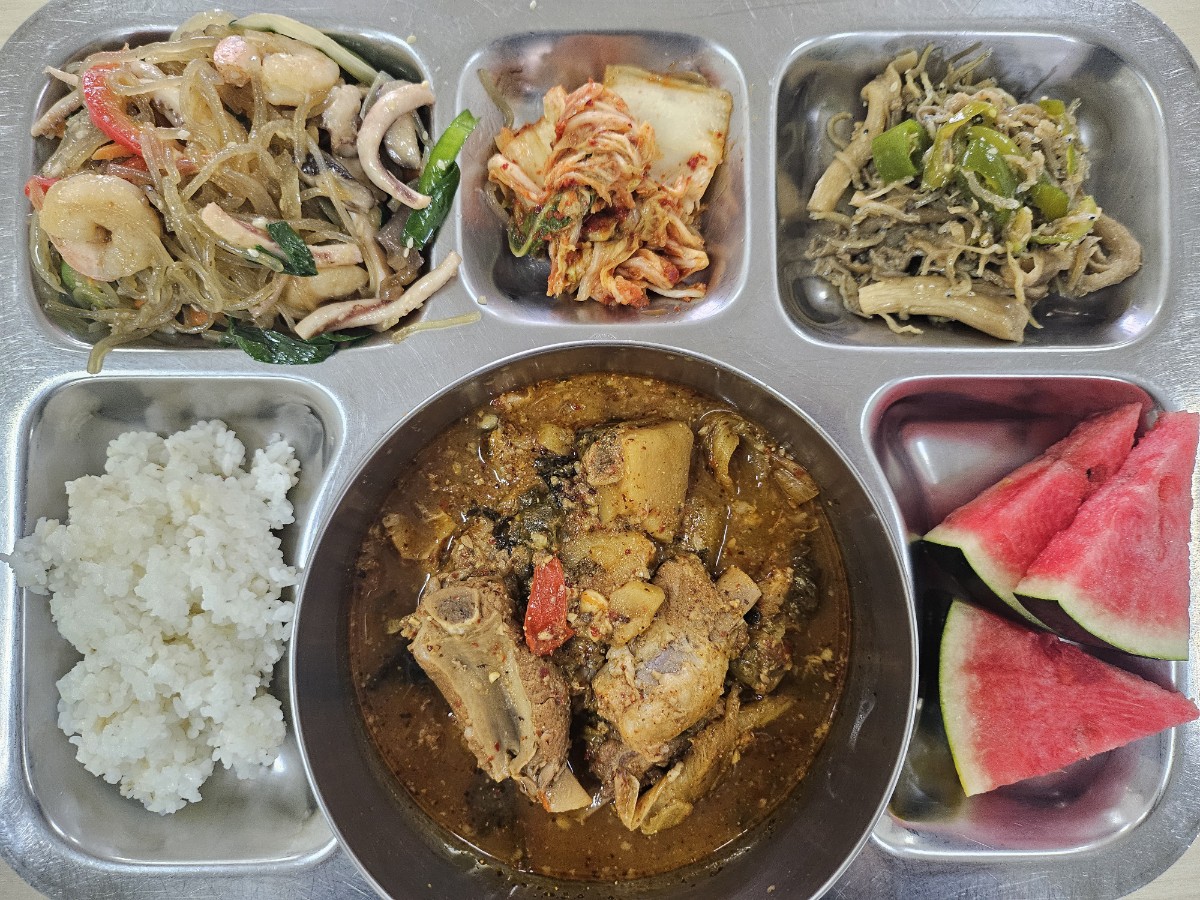 보리밥, 돈갈비감자탕, 해물잡채&겨자소스, 느타리버섯멸치볶음, 배추김치, 수박, 쌈채소